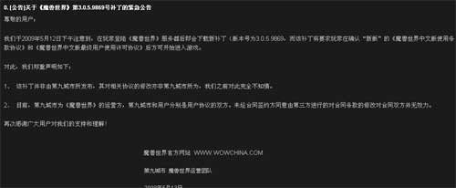 我們于2009年5月12日下午注意到,在玩家登陸《魔獸世界》服務(wù)器后即會(huì)下載新補(bǔ)?。ò姹咎?hào)為3.0.5.9869,而該補(bǔ)丁將要求玩家在確認(rèn)“新版”的《魔獸世界中文版使用條款協(xié)議》和《魔獸世界中文版最終用戶使用許可協(xié)議》后方可開始進(jìn)入游戲。