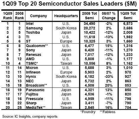 德州儀器的排名下降到了第四位,東芝超過德州儀器上升到了第三位。高通第一季度的排名從2008年的第八位到了第六位。聯(lián)發(fā)科技從去年的第二十五位上升到了第二十位,其第一季度的銷售收入比2008年第四季度增長(zhǎng)了16%。IC Insights稱,這主要是因?yàn)椤按粼诩业慕?jīng)濟(jì)”(失業(yè)經(jīng)濟(jì))推動(dòng)了數(shù)字電視集成電路的銷售。